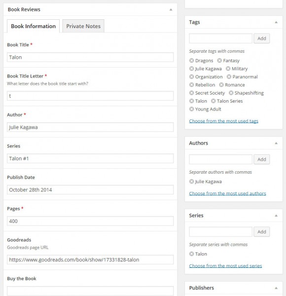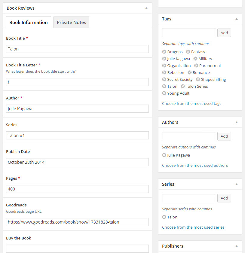 I have created boxes for every piece of book information. The HTML then gets formatted automatically and put into my review. But since I store the book title and author (and other data) in separate fields, I can retrieve those fields and manipulate them. That’s how I created automated archives sorted by title, author, and a variety of other ways. I use PHP to pull out all the book reviews, rearrange them, and display them in a separate way.