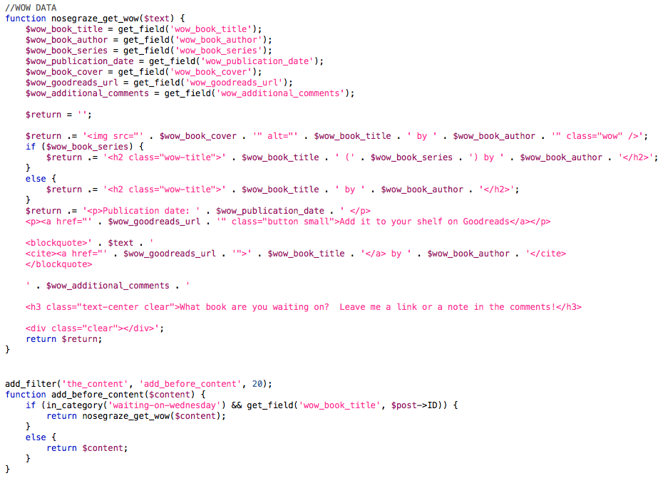 When you first install Advanced Custom Fields and create the boxes you want through the user-friendly interface, that’s all you get… boxes. Those boxes don’t do anything or show up anywhere. In order to actually format the HTML and get it to properly display in your post, you need to know how to code. I’m not just talking HTML and CSS, I’m talking PHP. You have to be able to edit your theme files to implement this. That’s why Advanced Custom Fields probably won’t be a good option for your average book blogger.