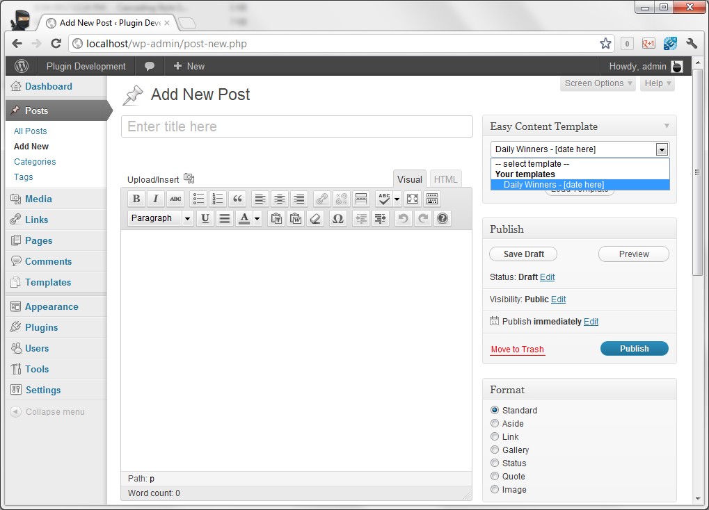 I’ve been trying to figure out how to create template posts for the longest time, for memes and my own memes. I should have realized searching here would give me the answer. LOL. I was going to use the Advanced Custom Fields plugin, but for some reason, the plug in is conflicting with WP 3.9 – when I have it activated, the editor for posts loses a LOT of its functions. :sigh: So I may have to give that other plugin a whirl. 😀