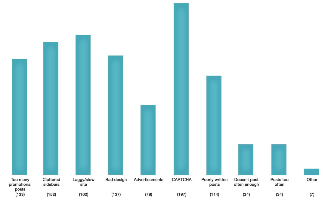 It’s no shock here that CAPTCHA takes the gold. But another big one is having a cluttered sidebar and a slow/laggy blog (which is usually a result of a cluttered sidebar!). So strip them down to the basics, people!