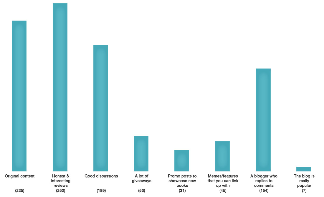 I’m pleased that readers don’t write off new blogs immediately, and also that most of the readers are in it for the reviews. I admit, reviews are my main reason for visiting book blogs and it was nice to see this consolidated. I also found it interesting to have my own view confirmed of just how important looks are when judging a blog.