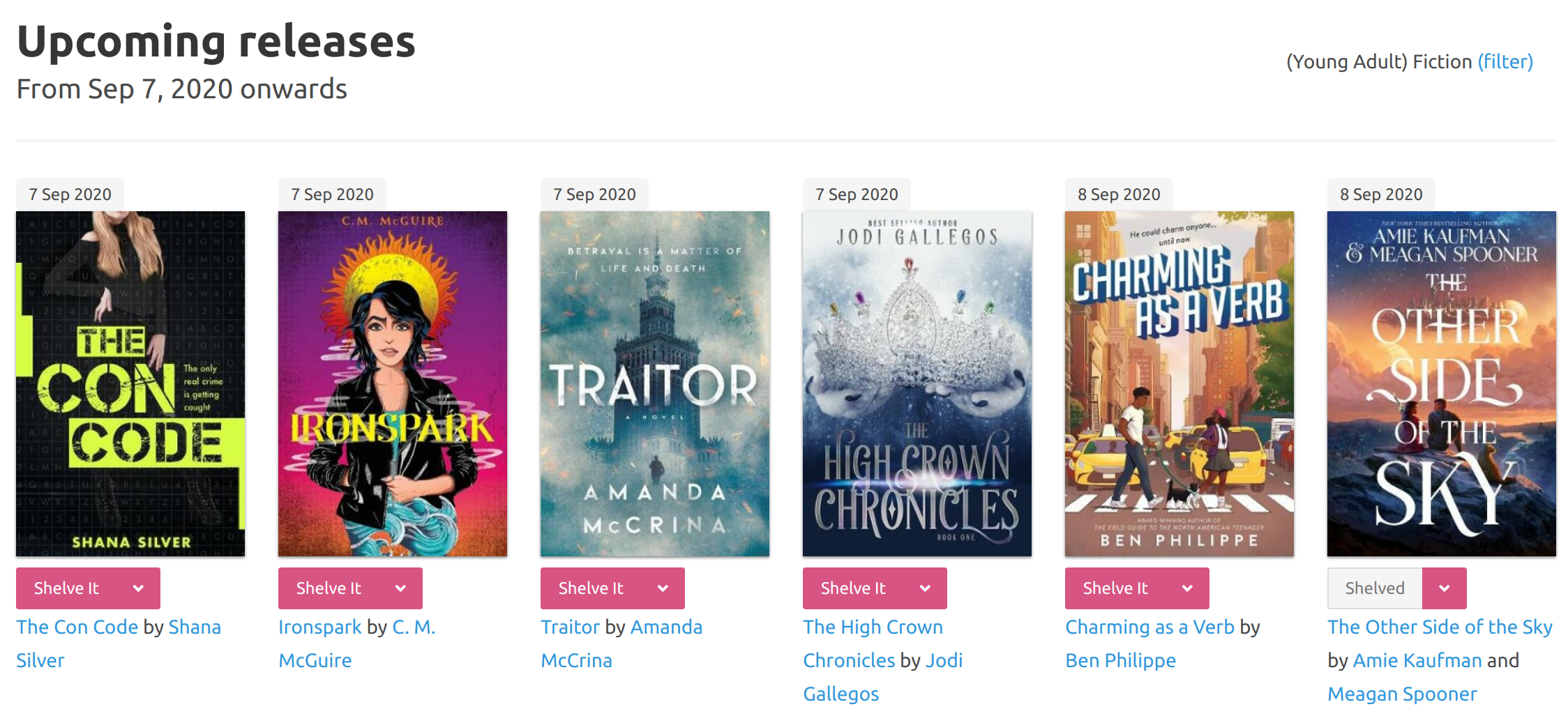 This is one of the big reasons I made Bookhype in the first place—I wanted a release calendar. I wanted to easily be able to see all fantasy books coming out in the future so I didn’t miss anything. The Bookhype releases page allows you to do just that. You can filter by genre, age group, and year/month/day. Want to look at YA fantasy in 2021?