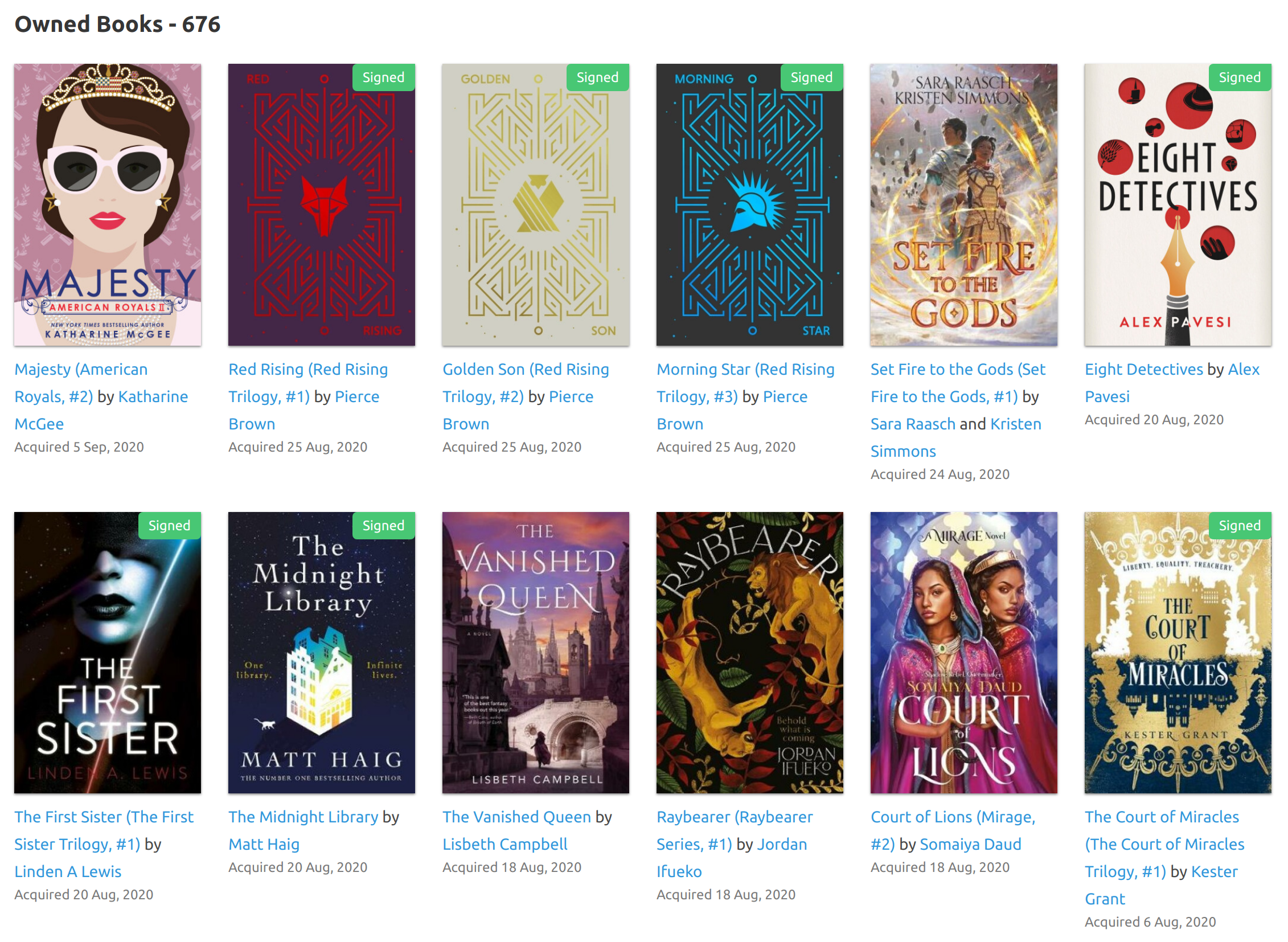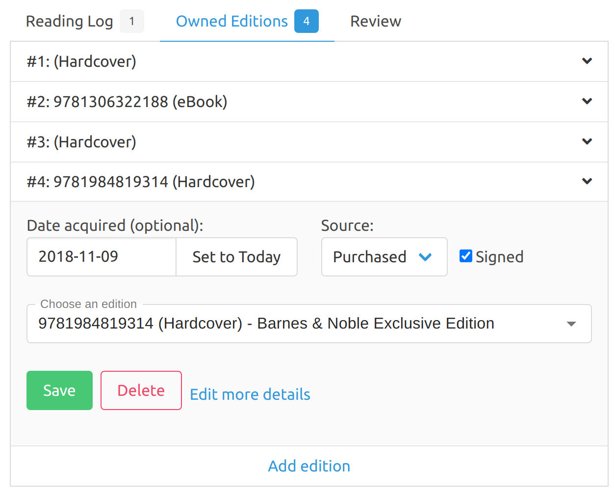 For each record you can choose which edition you own, the date you got the book, where you got it from, and whether or not it’s signed.