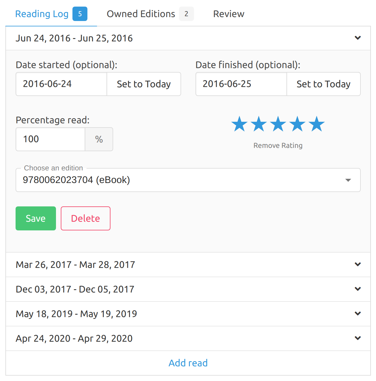 For each book you can also record the dates you read the book, which edition you read, and what you rated it (you can have different ratings for each entry!). If you reread, like I do, then sometimes your rating changes from one read to the next. I like to keep records of all my historical ratings.