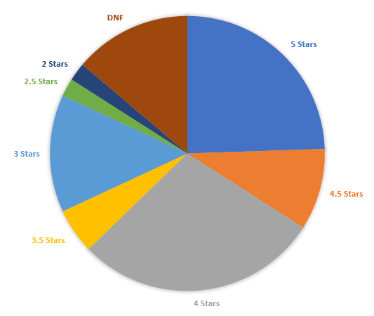 You can see I didn’t have that many low star reads this year and that’s because I’ve become a merciless did-not-finisher. If a book didn’t grab me (even after as few as 10 pages or so), I just put it down. I’d rather spend more time reading awesome books I adore.