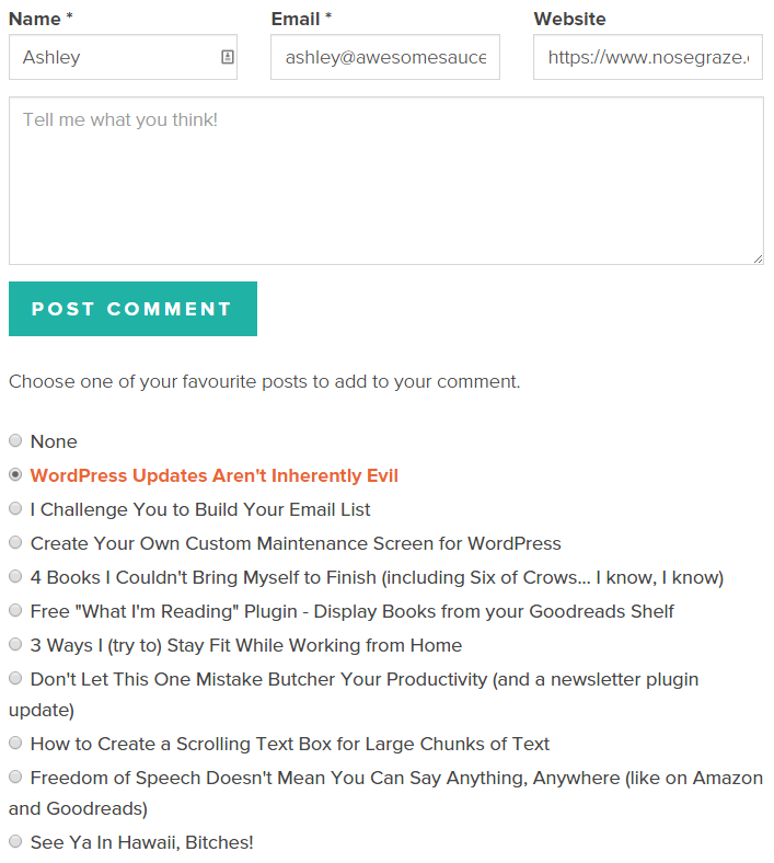 - When they click “Post Comment”, we send the chosen blog post URL and title back to WordPress and save that data with the comment.