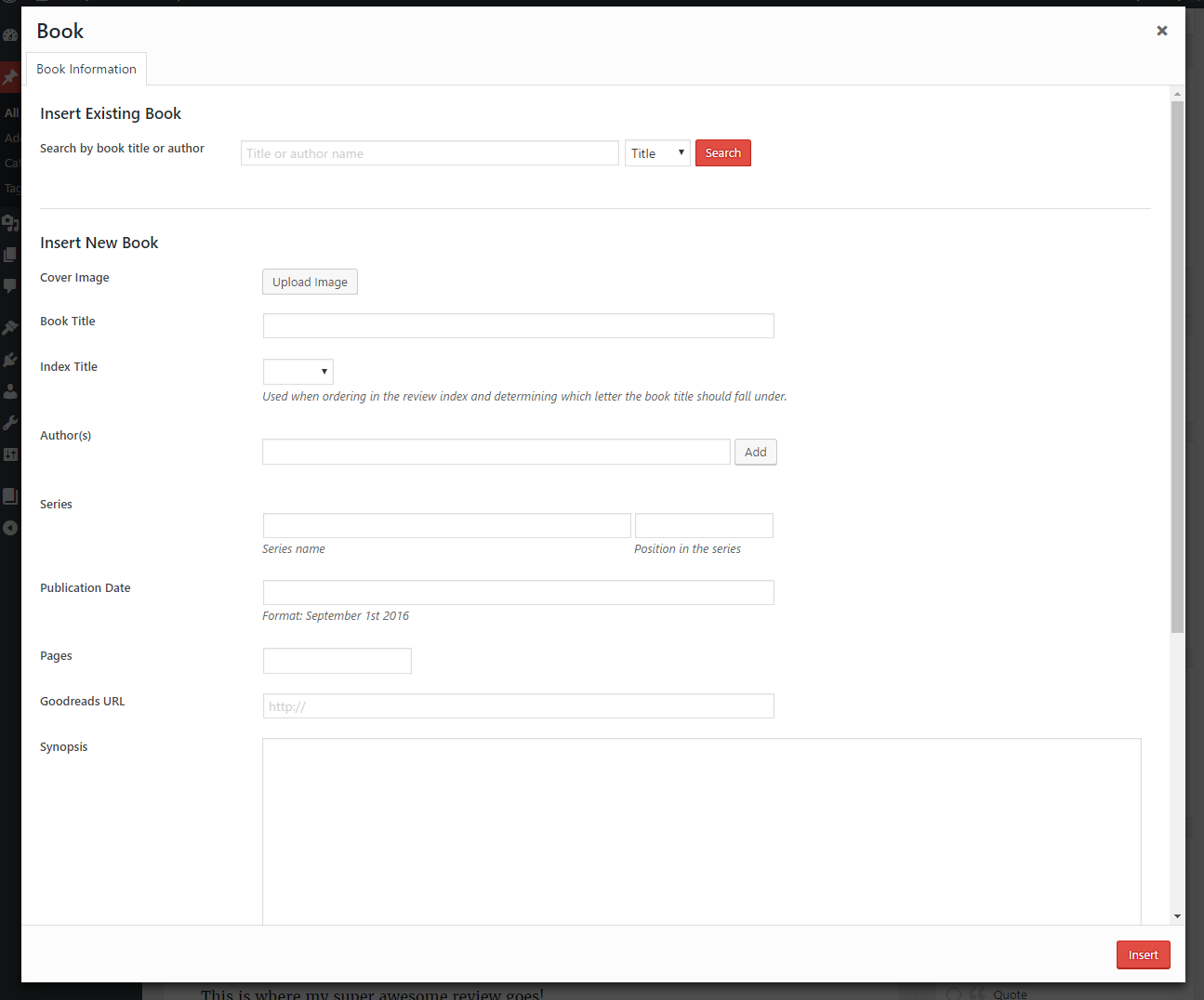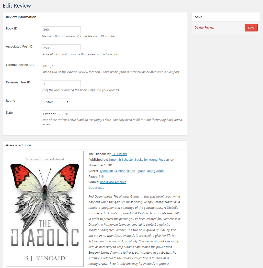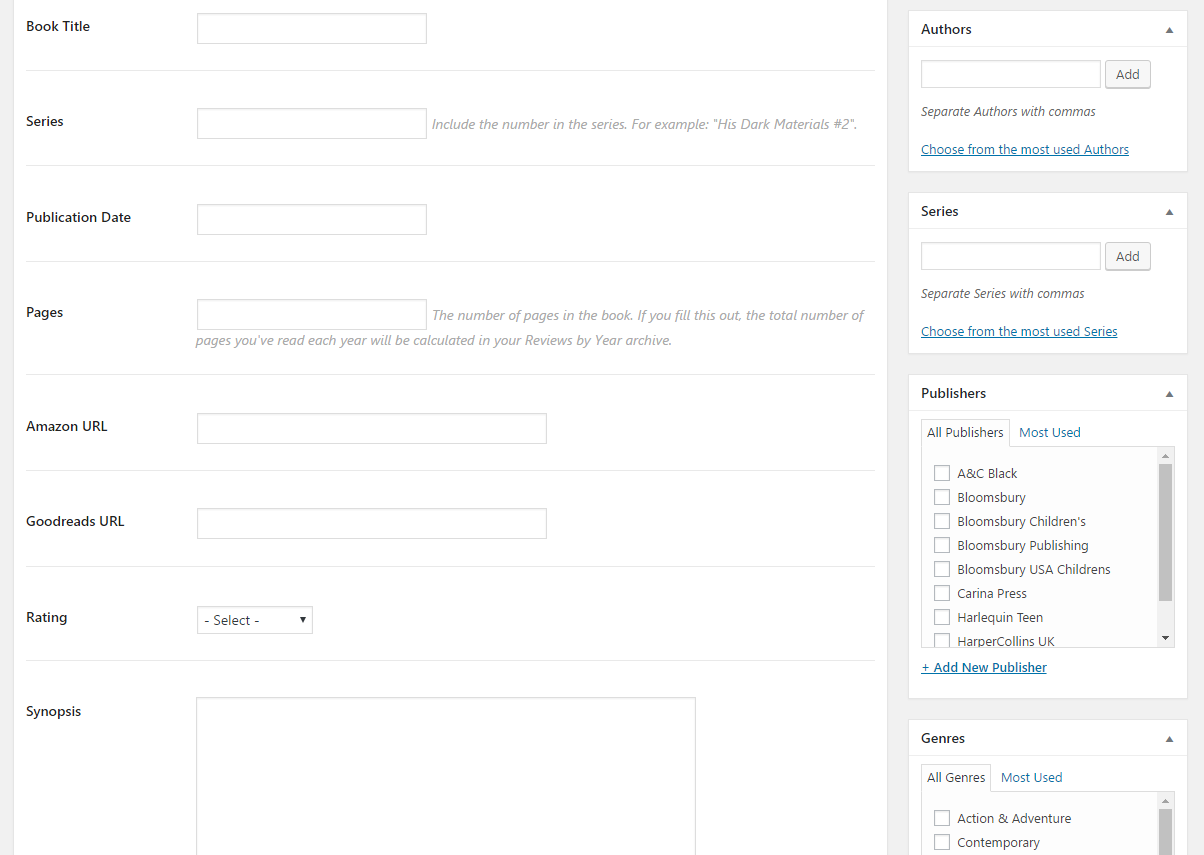 Books and reviews are kept separate, but you can link a review to a book. This separate system allows me to also add a book’s details to a post without needing a review if I don’t want one.