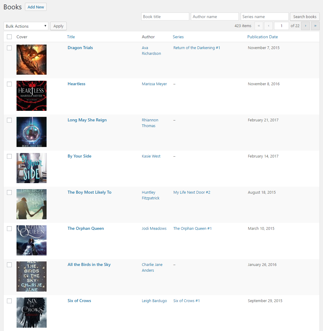 And I wanted #2 for a few reasons.. Most people would probably gravitate towards custom post types (one for ‘Books’ and one for ‘Reviews’) and while I totally get that approach, I ultimately decided against it. I just really wanted to build this plugin into something that scales really well (thousands and thousands of books), and I wanted the data to be easy to manipulate and fast to query. I ended up needing to replicate a lot of core code to work with my custom tables, but in the end it’s working in a way that’s 100% perfect for my project.