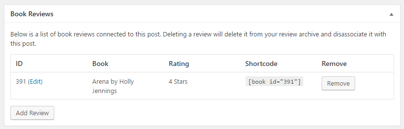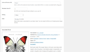 So to add a review, there’s a separate box below the editor for “Book Reviews”. I click “Add Review”, select which book it’s for, choose my rating, and press “add”. This creates the new review entry and associates it with the post.