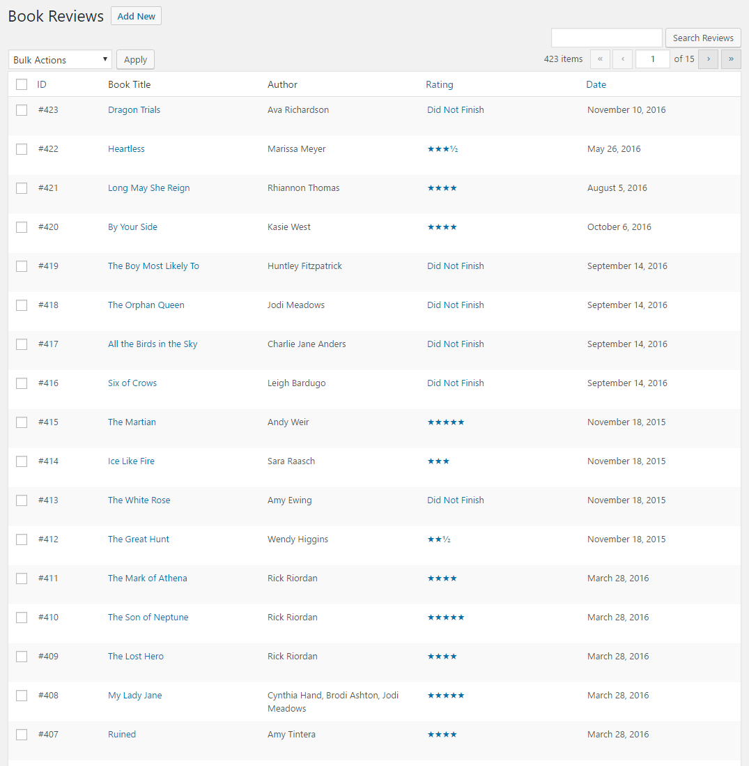 A huge problem with UBB is people having thousands of reviews and then running out of memory to display them all on a page. This is partly because of how book info is added to posts via post meta, and it’s just a bit convoluted. This new display breaks the results up into multiple pages, but also has pretty awesome searching/filtering.