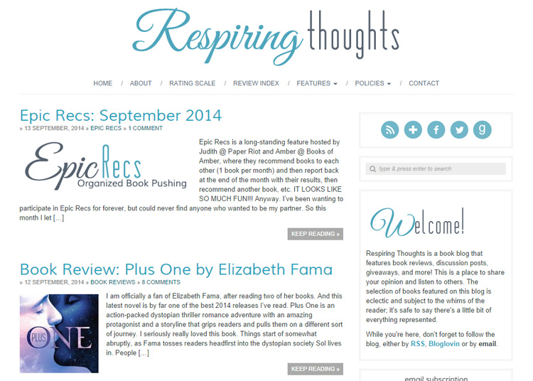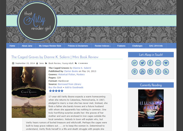 That Artsy Reader Girl’s design has been one of my favourites for a long time. I think she did a fabulous job puttin gall the colours and graphics together. I also love her header! It all ties together so nicely and is super crisp and clean.