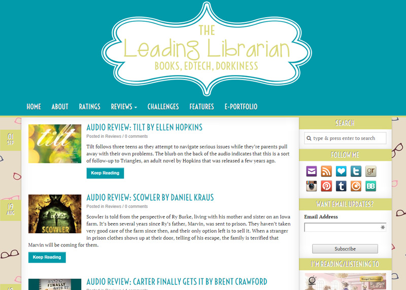The Leading Librarian design is one of my favourites because it uses the old Nose Graze theme (Charlotte) but the look and feel is SO different! I love the colours that she chose (the blue and yellow). I think they go brilliantly together. She also uses the Voltaire font that I mentioned when I listed 37 fonts I love.