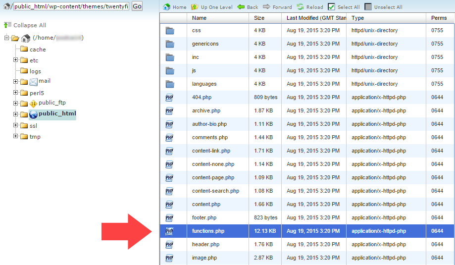 Now you’re inside the folder of your theme. And guess what’s in there! functions.php (or whatever file you were editing before your site crashed).