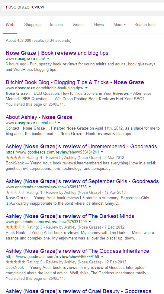 But the real kicker is that Goodreads is starting to beat out my own blog in search rankings. It’s like Google did a total 180 on me. Instead of only showing my reviews in search results, it’s now only showing my reviews on Goodreads and not the ones on my blog. If I Google nose graze review, I would expect to see the reviews on nosegraze.com. Instead, I get this: