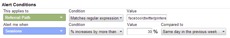 - Daily: If the referral path matches regular expression facebook|twitter|pinterest|stumbleupon|tumblr and the sessions increase by more than 30%.