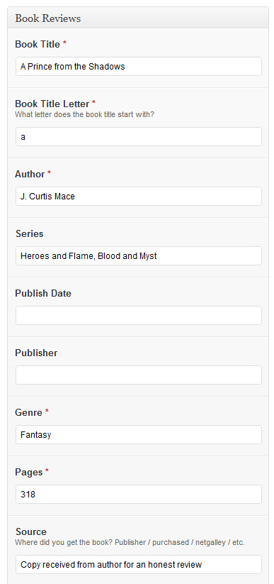 What you’ll have to do is set up custom fields for book title, author, publisher, date, format, source, genre, blurb, and the goodreads/buy it now links! Also depending on your set up you might need one for the book cover too. I don’t have one for book cover since I use the featured image, but if you don’t (like if you insert it into the post) then you’ll need one for the image as well.