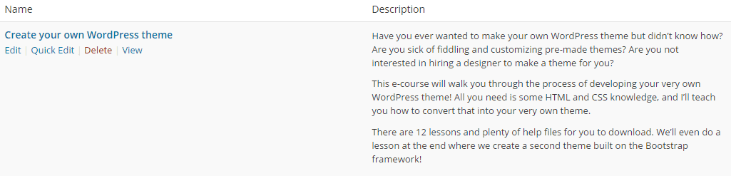 Each topic is its own e-course. Right now I only have one: Create your own WordPress theme. So each lesson I create gets assigned to this topic.