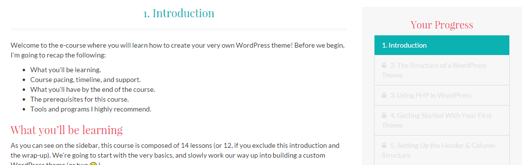 - Pages that display the individual “posts” (in this case, e-course lessons). The post equivalent would be the page of an individual blog post.