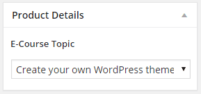 Inside Easy Digital Downloads, I created a new selling category for E-Courses. This is the category I’d place all my e-course products into. Then I created a new custom field for the products where I could select which e-course topic that product corresponded to. So in the image on the right, you can see I’ve selected the “Create your own WordPress theme” topic. This way, the product listing connects to the e-course custom post type topic.
