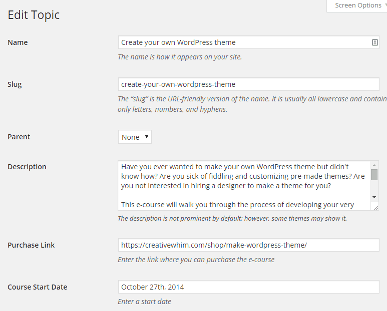 In order to separate my lessons into different e-courses, I then created a custom taxonomy for “Topics”. In WordPress, taxonomies are categories and tags. Just like how you can duplicate “Posts” or “Pages” into custom post types, you can duplicate categories and tags into your own custom taxonomies. If you’ve used the Ultimate Book Blogger Plugin, you’ve probably seen the custom taxonomies for Genres, Publishers, Authors, etc.