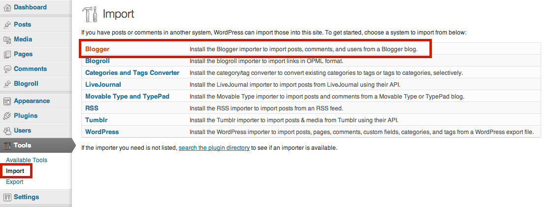 A new page will pop up asking you to install the Blogger Importer. Click Install Now.