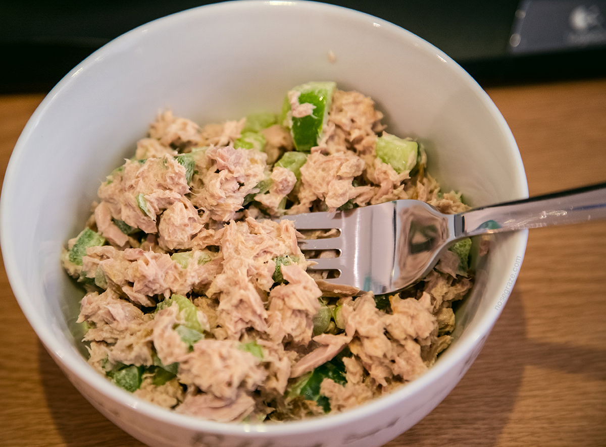 With tuna, mayonnaise, celery, green onion, green onion. I’ve always bought tuna salad but this was my first time actually making it!