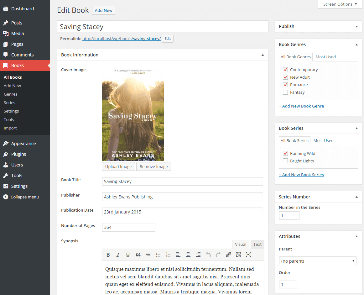 Novelist adds a new section in your admin panel for “Books”. Instead of creating a new page (Pages > Add New) for each book and then manually trying to format the book page, Novelist makes it so much easier. You create a new book (Books > Add New) and just fill out a super simple form with all the book information.