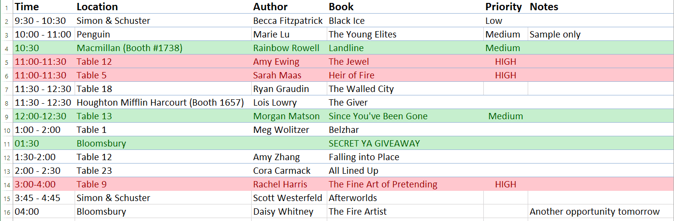 Sometimes there will be a galley drop for a book on Thursday morning, an author signing for that same book Thursday afternoon, and another galley drop on Friday. If this is a book I want, I add all of them to my schedule. I just add a note in my “Notes” column that there will be other opportunities to get that same book. That way, when I’m going through my schedule on the day, I know I can skip one of those galley drops if something else is taking priority, and I know I can still get the book another time.