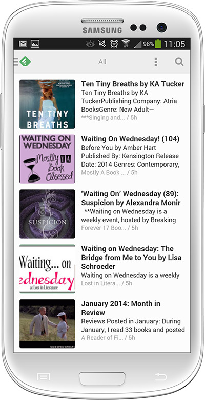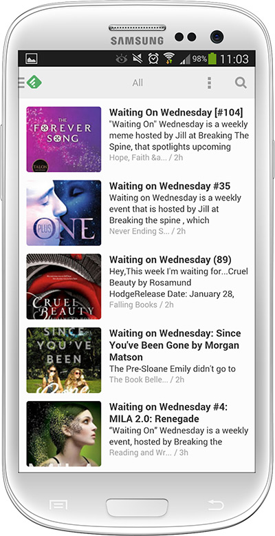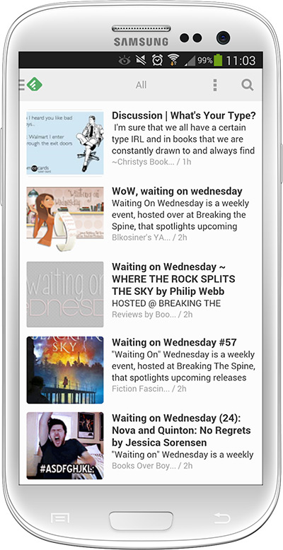 Out of 4 “pages” of my reader, 15 out of the 20 results are Waiting on Wednesday posts. And keep in mind that there were more pages I didn’t screenshot! This is insane. I have no desire to read through all those. Plus, I know exactly what the topic is (a book you’re looking forward to), so if I choose to glance at it at all, I just look at the Feedly thumbnail, immediately know what book you’re “waiting on”, and then keep scrolling.