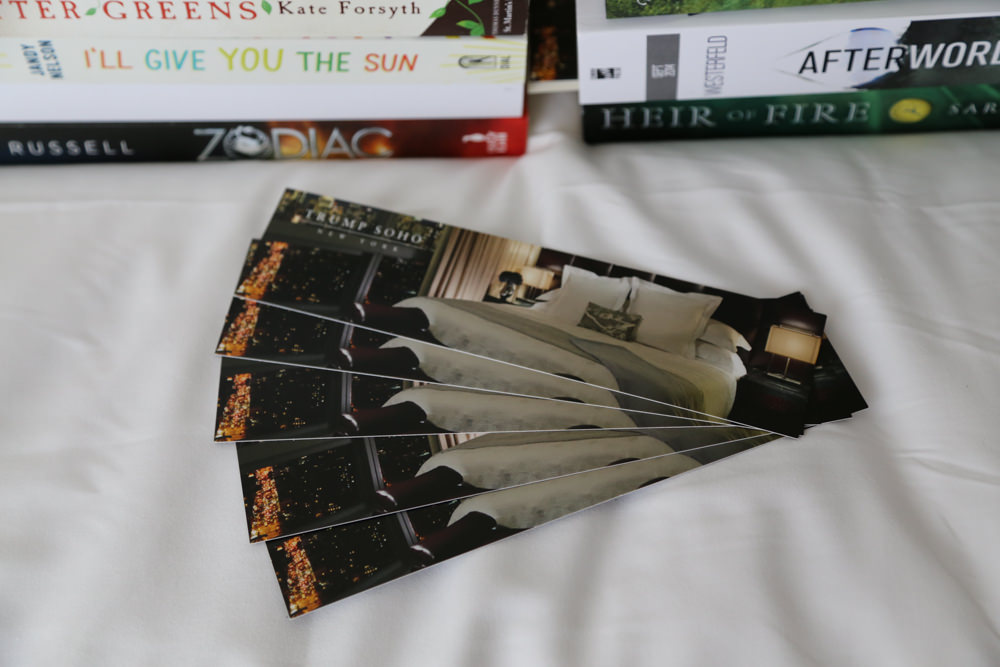 Over the past few days I’d been lining my books up on the hotel room desk.. and today, the cleaning staff decided to respond by inserting a Trump SoHo hotel bookmark into my current read and laying 5 more hotel bookmarks on the desk. TOO CUTE!