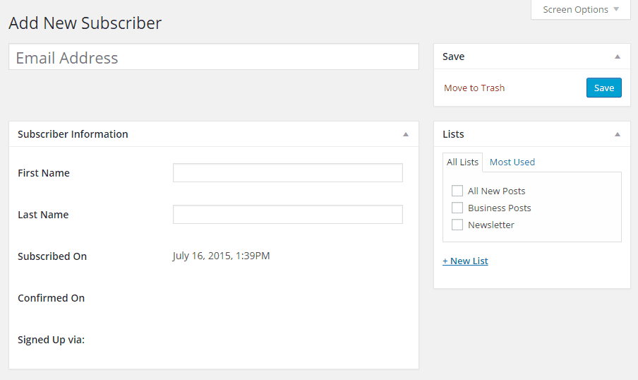 The “Lists” page is similar to a category or tag page. This is where you can add a new list. Lists are used to group subscribers together. So on my current blog, some of the lists I have include: