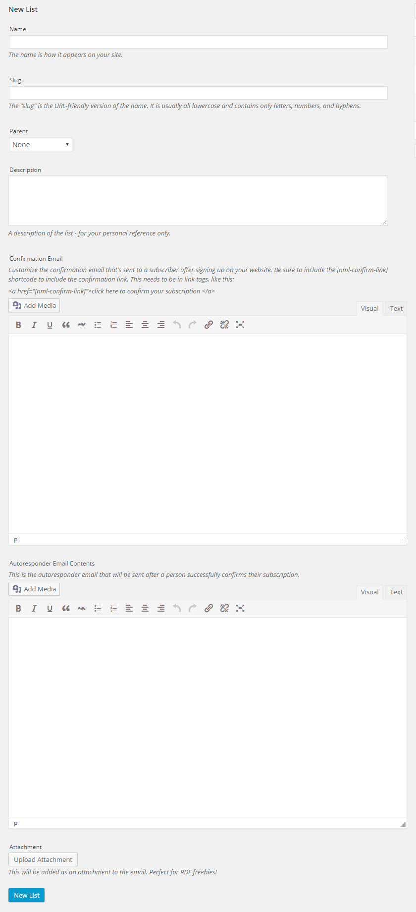 - Autoresponder Email Contents: You can optionally have another email sent out after they’ve confirmed their subscription. If enabled, you can change the contents of that autoresponder from list to list.