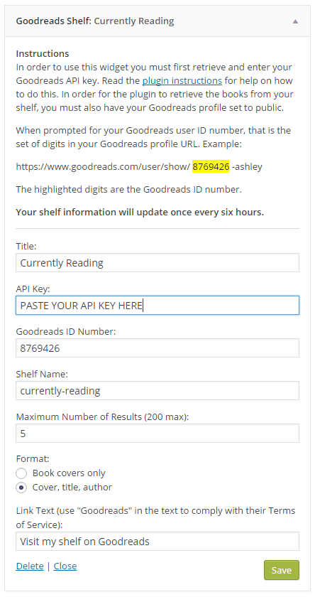 Once you’ve entered your API key in the correct box, you need to get the ID number of your user account. This can be found in your Goodreads profile URL.
