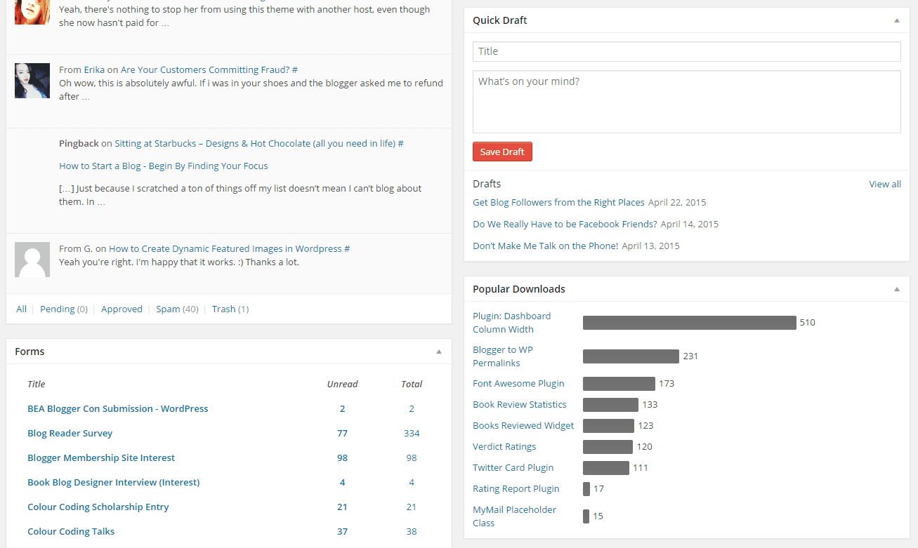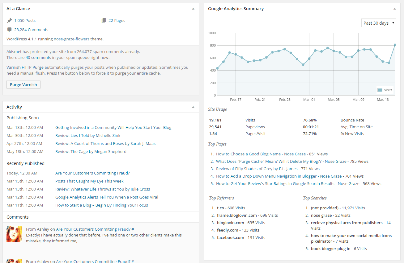 I’ve got the latest comments, and my stats on the dashboard. I have a different Google Analytics plugin, but I am loving the look of yours more. I’m going to be trying it out, because it’s so much more detailed that mine!