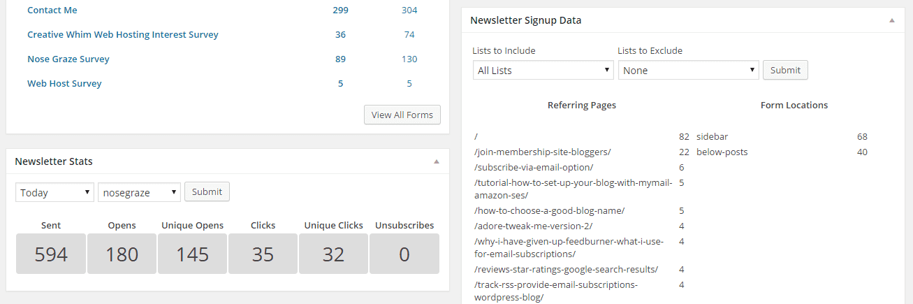The “Newsletter Signup Data” widget on the right is a recent addition. It shows: